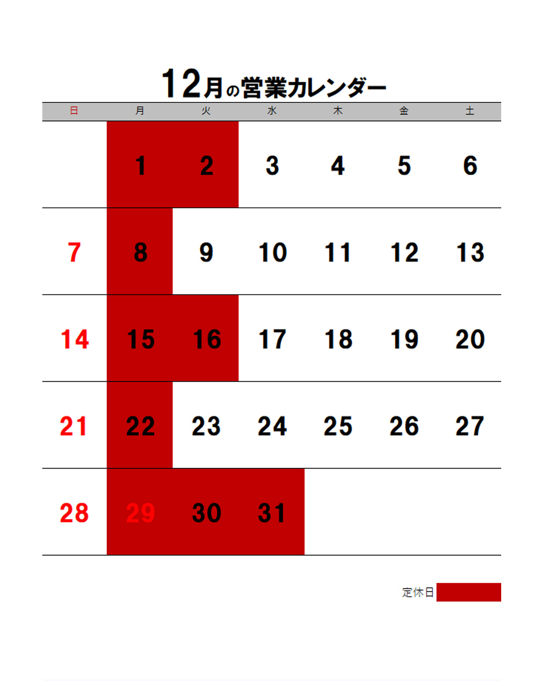 11月・12月の営業カレンダーについて